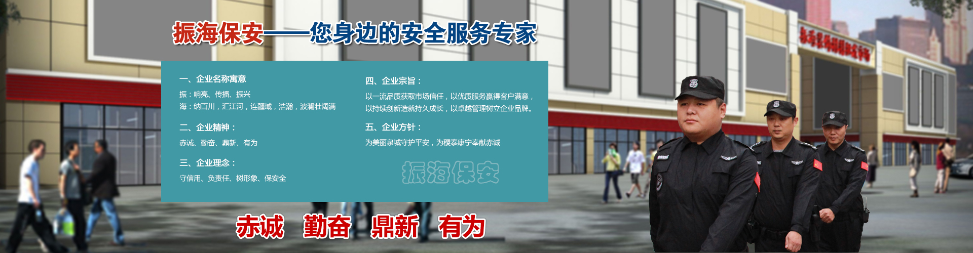 山東振海保安服務(wù)有限公司是一家專業(yè)的保安服務(wù)公司,提供人防安保、臨時勤務(wù)安保、危機處理安保、犬防安保、反跟蹤、調(diào)查、商業(yè)間諜等服務(wù),公司成立于2015年5月,是通過國家公安部門資質(zhì)認證,經(jīng)山東省公安廳和濟南市工商局批準(zhǔn)成立的綜合性民營保安公司。公司立足濟南,面向山東省內(nèi)外,開展的業(yè)務(wù)涵蓋人防、技防、安檢、守護、隨身護衛(wèi)、大型活動特勤等安保項目。公司總部坐落于濟南市市中區(qū)英雄山立交樞紐南側(cè)振海裝飾材料市場大樓;公司培訓(xùn)基地位于濟南市南部山區(qū)。